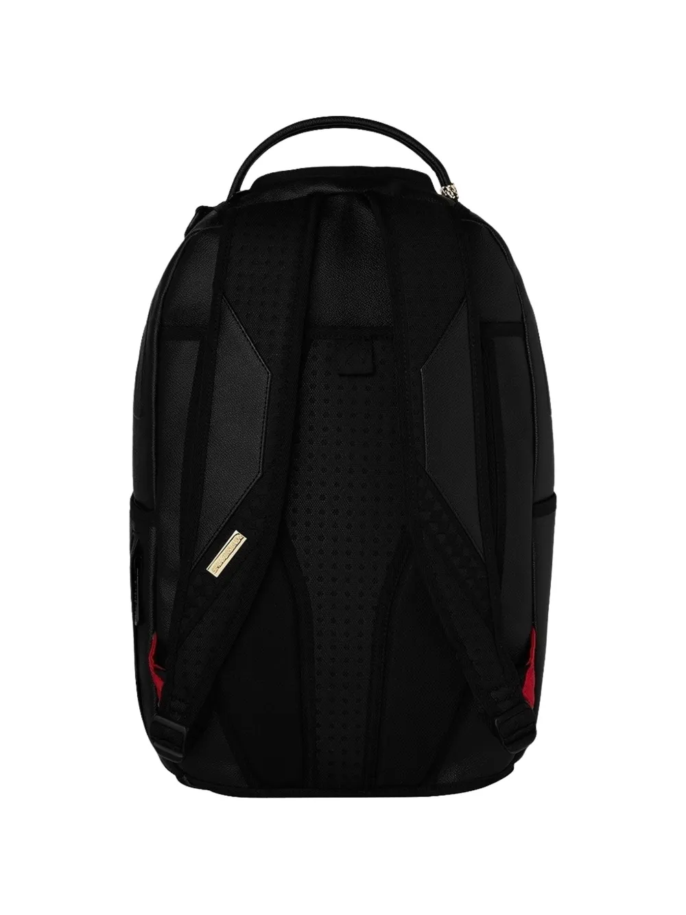 black grained texture Shark Mouth motif to the front Gold Brick Drip logo plaque single flat top handle two adjustable shoulder straps zip-around fastening gold-tone hardware