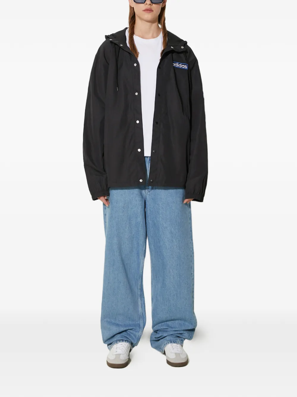 black patch detail drawstring hood side stripe snap fastening long sleeves