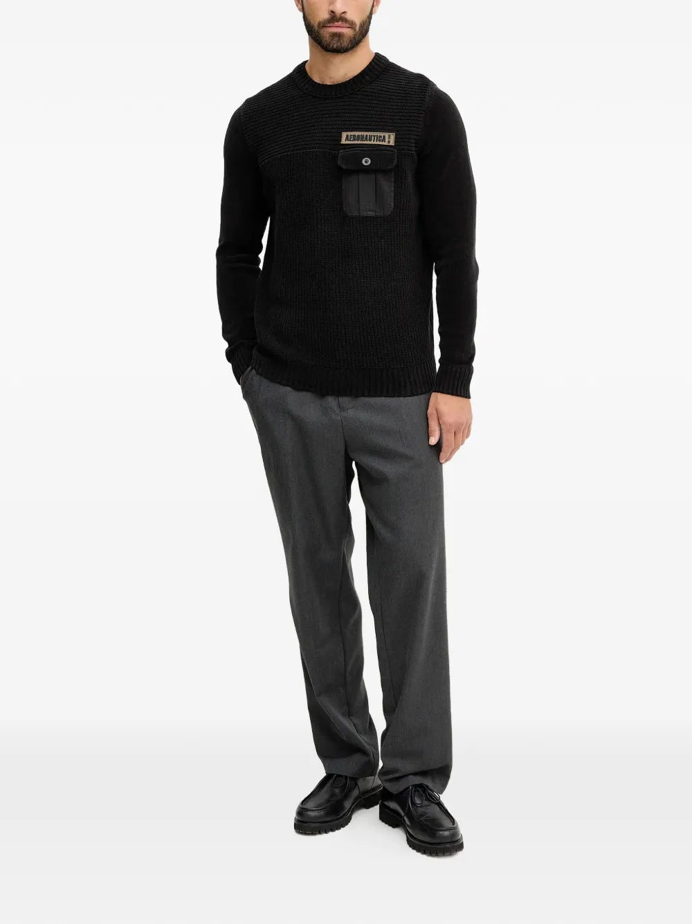 black tonal knit patch detail buttoned pocket crew neck ribbed trims