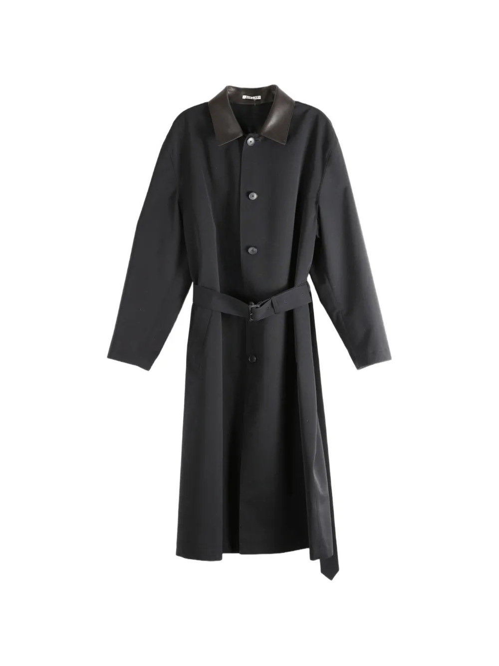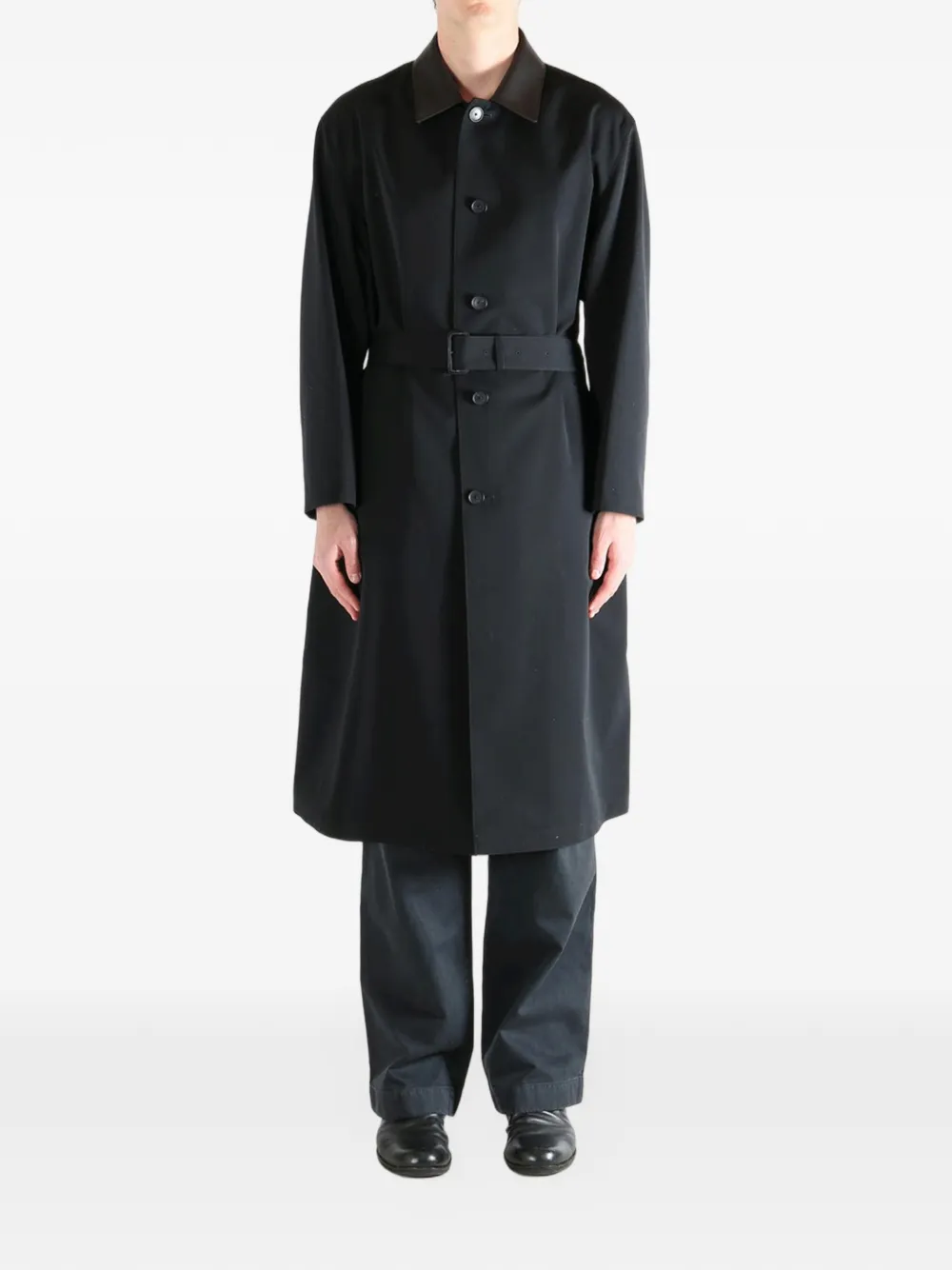 black wool contrasting collar front button fastening belted waist long sleeves central rear vent