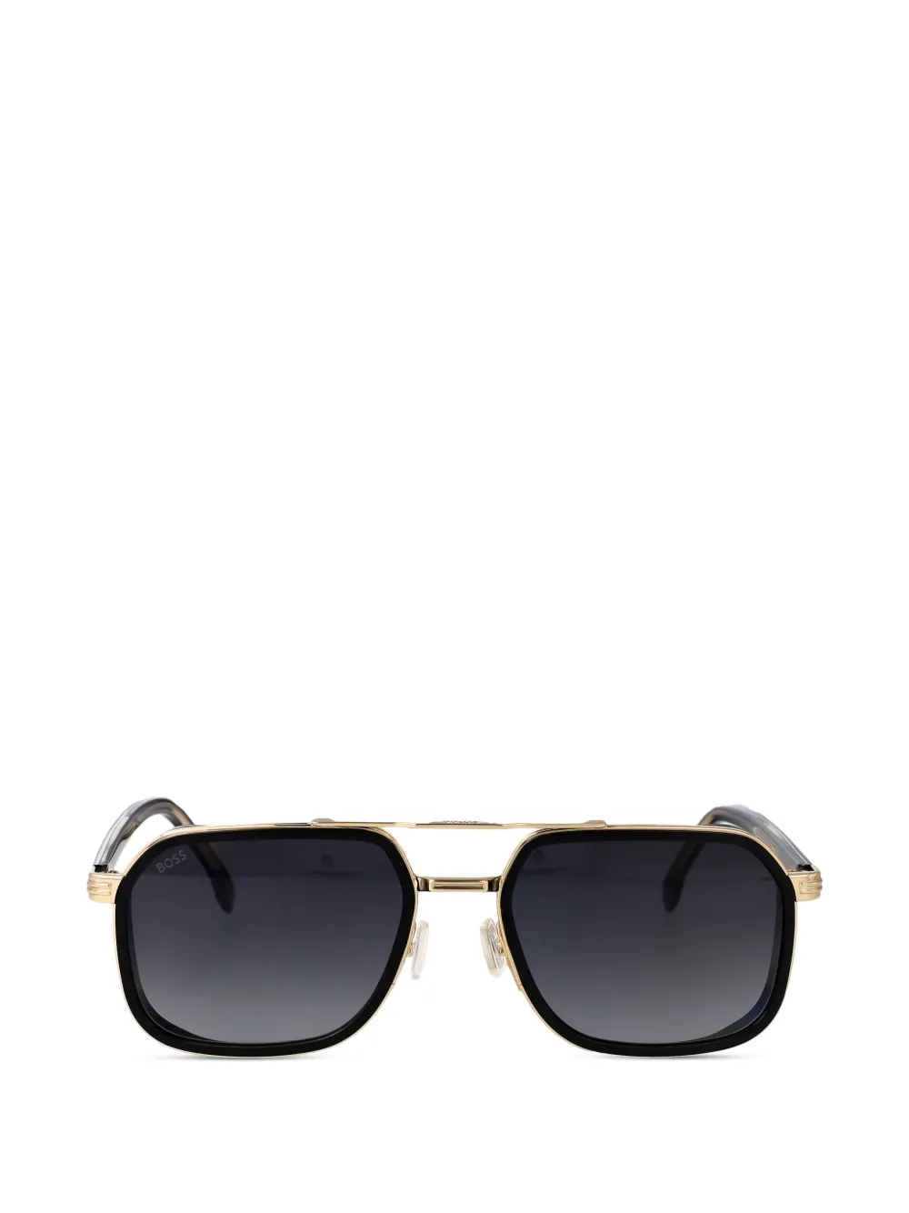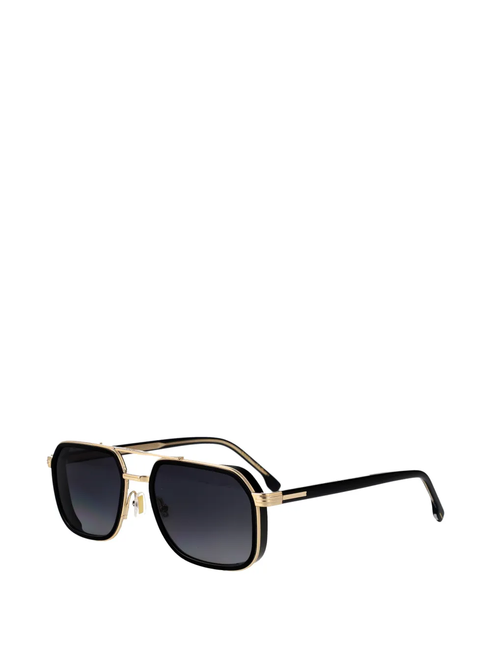 gold-tone/black square-frame double bridge grey-tinted lenses gold-tone hardware nose pads straight arms curved tips These glasses come with a protective case.
