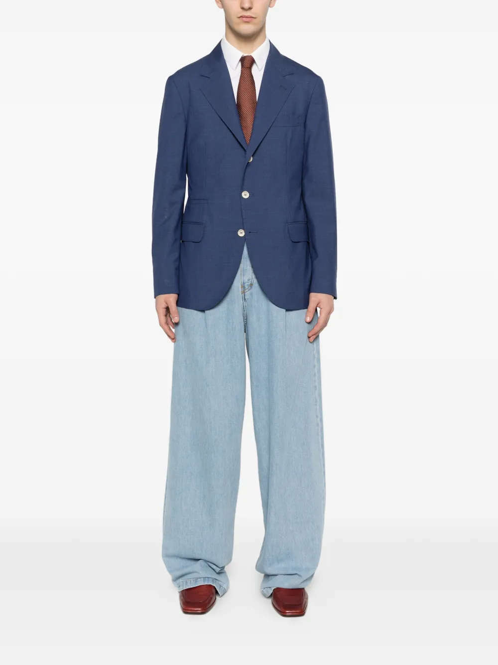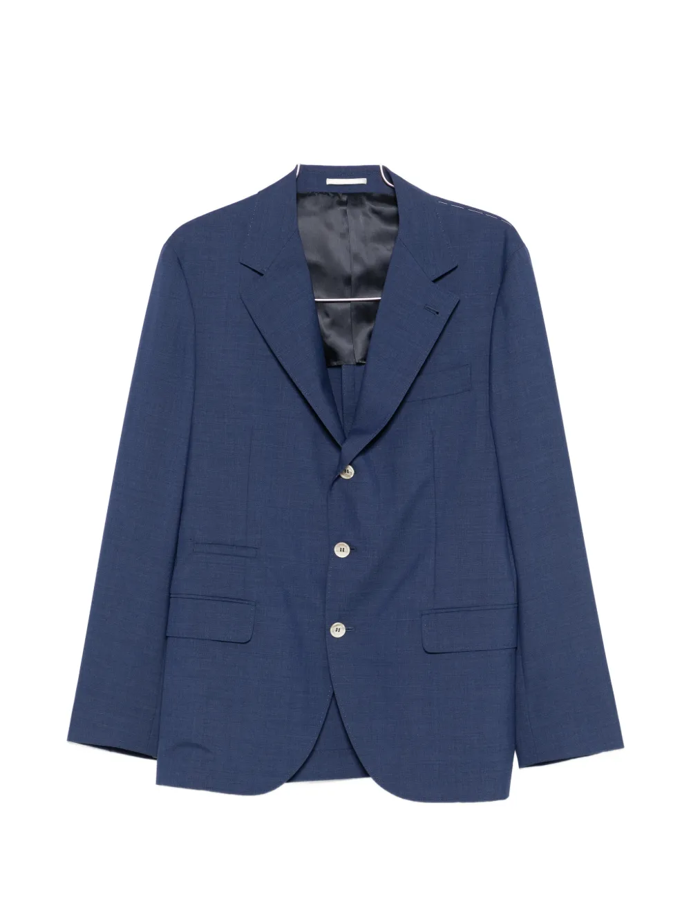 blue button fastening front flap pockets notched lapels long sleeves single-breasted