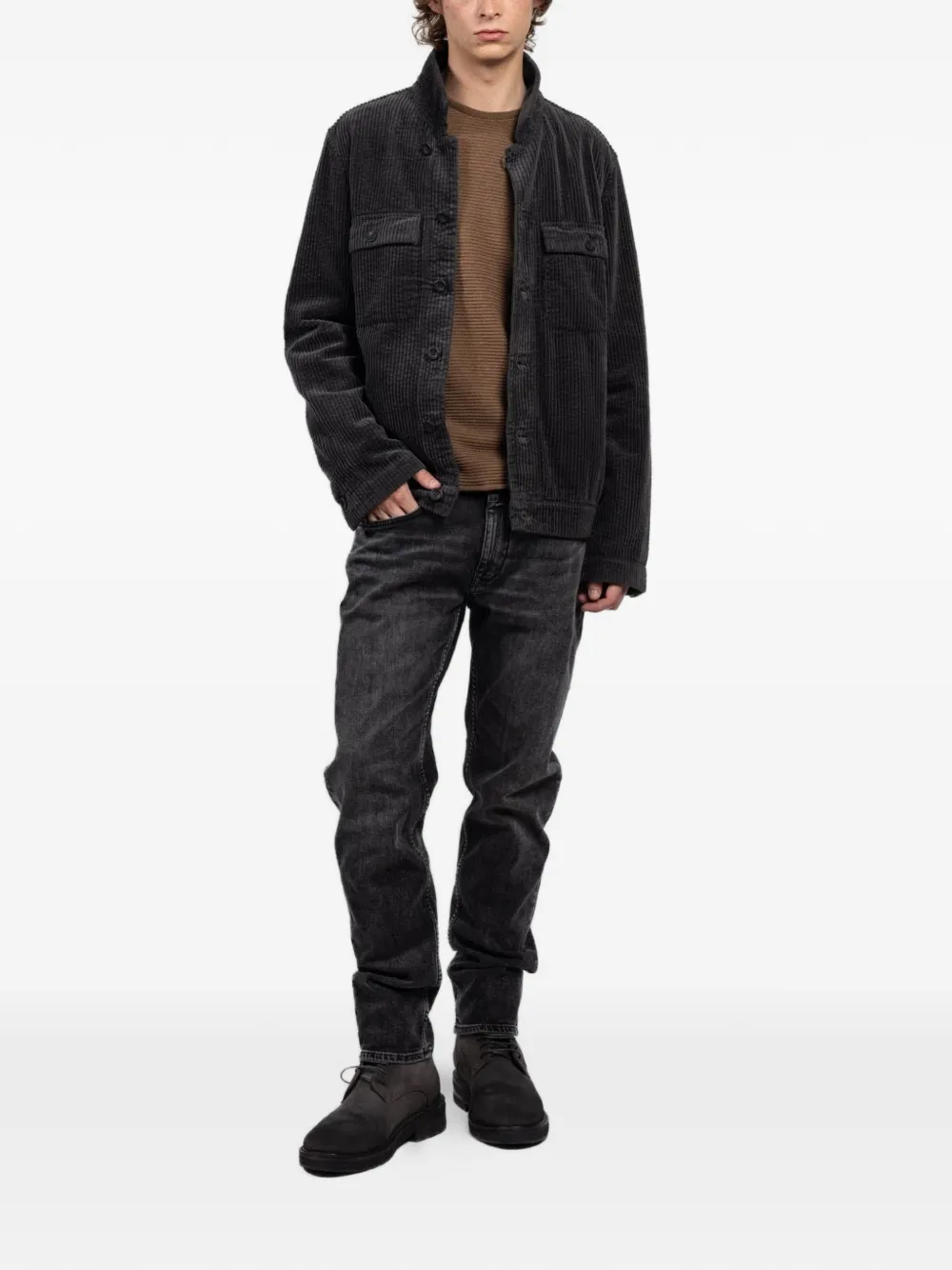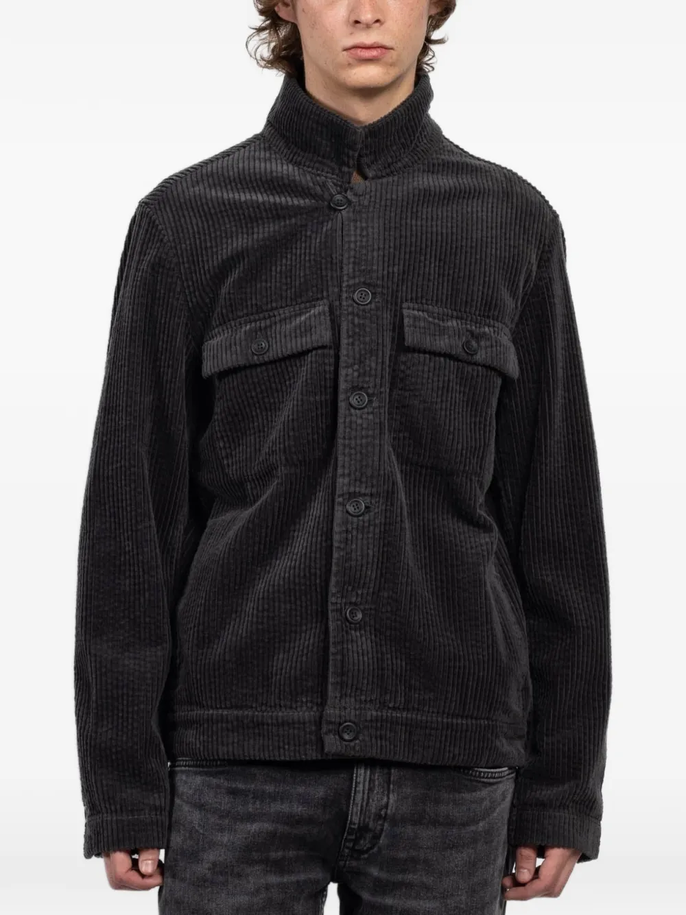 grey corduroy texture chest pockets button fastening stand-up collar long sleeves