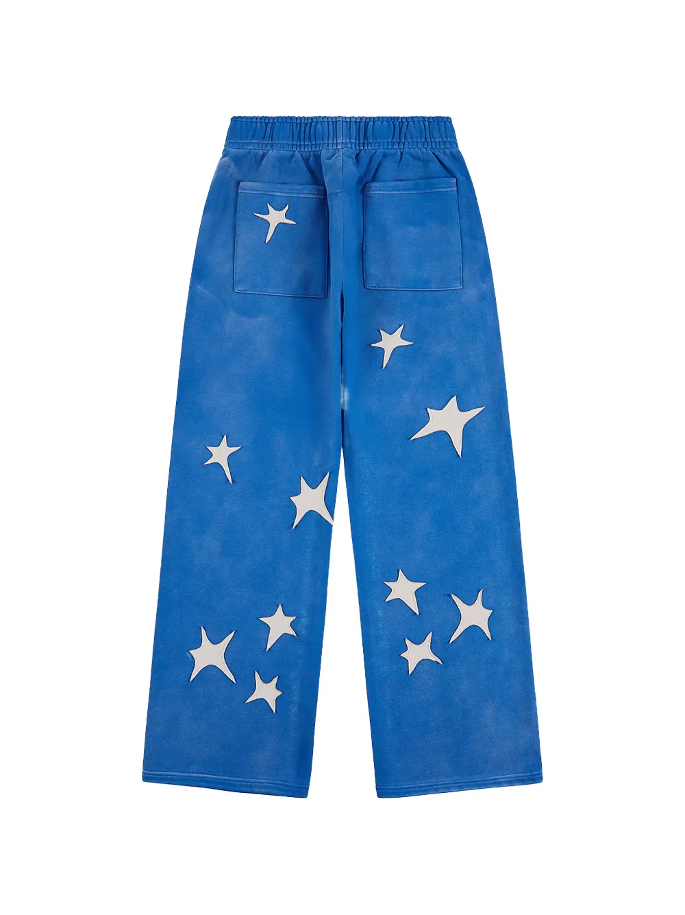 blue washed finish star patchwork elasticated drawstring waistband logo embroidered two side slit pockets two rear patch pockets straight leg