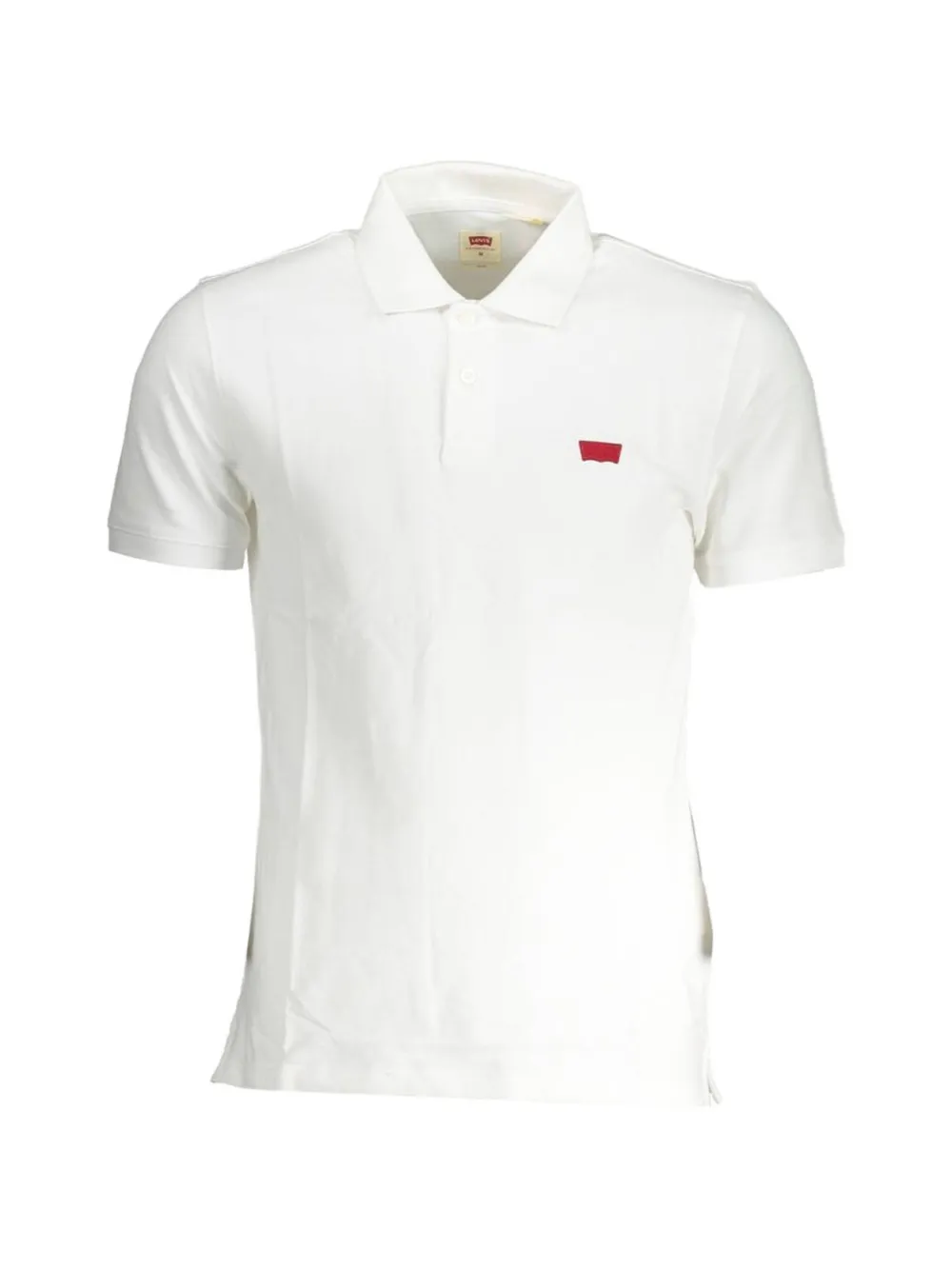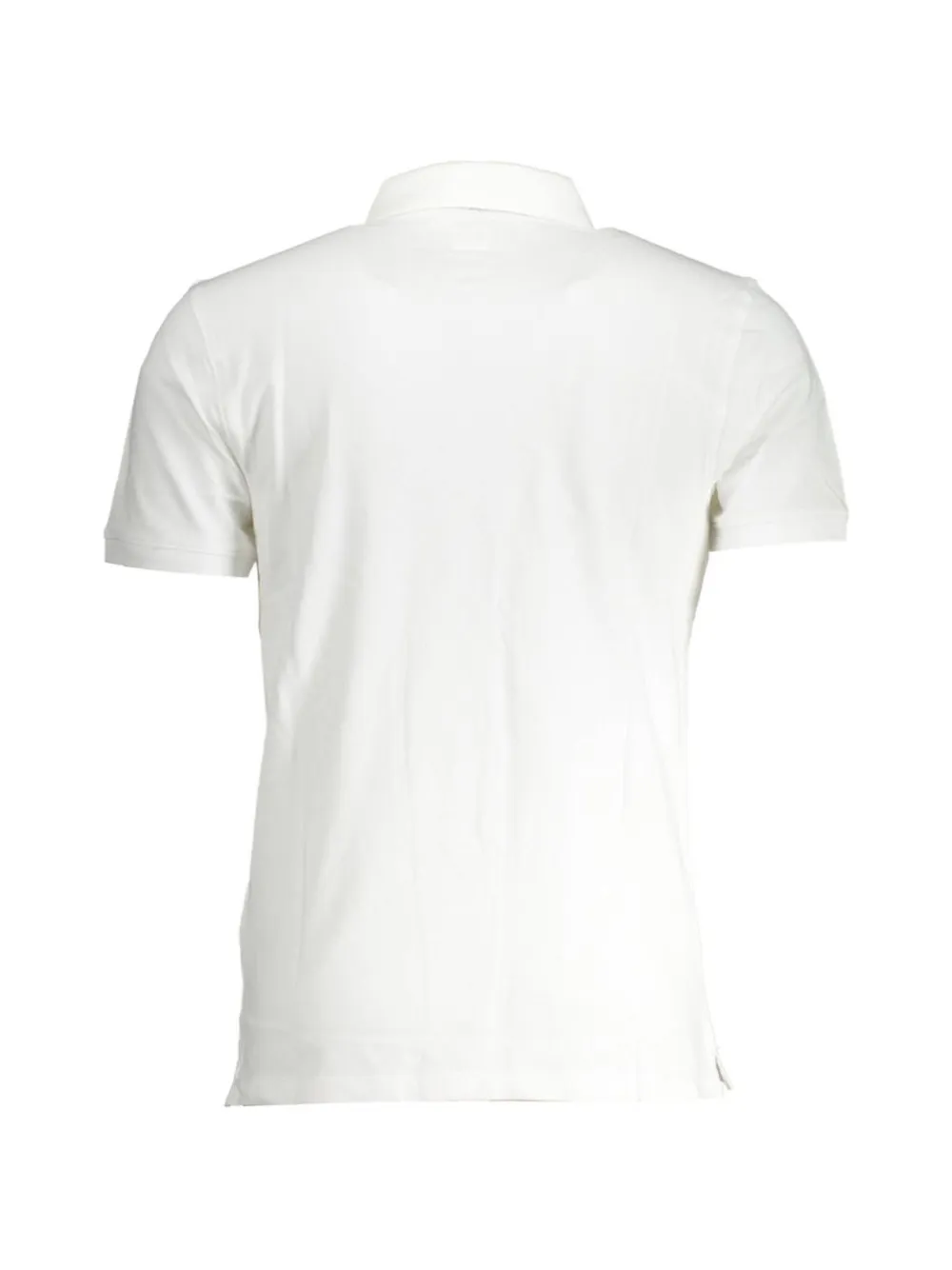 white cotton logo patch at the chest polo collar front button placket short sleeves straight hem side slits