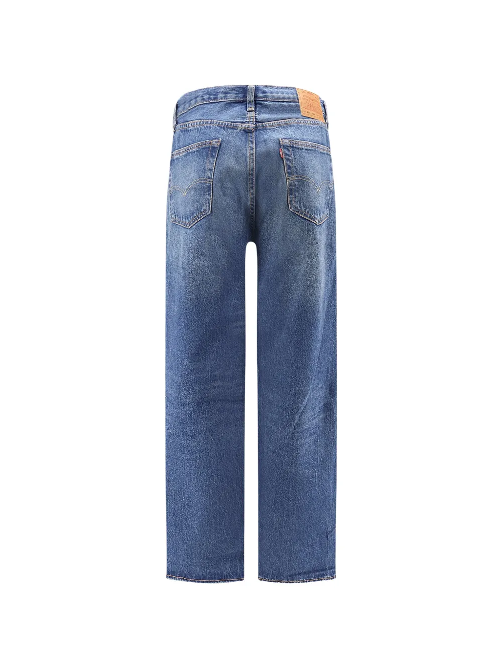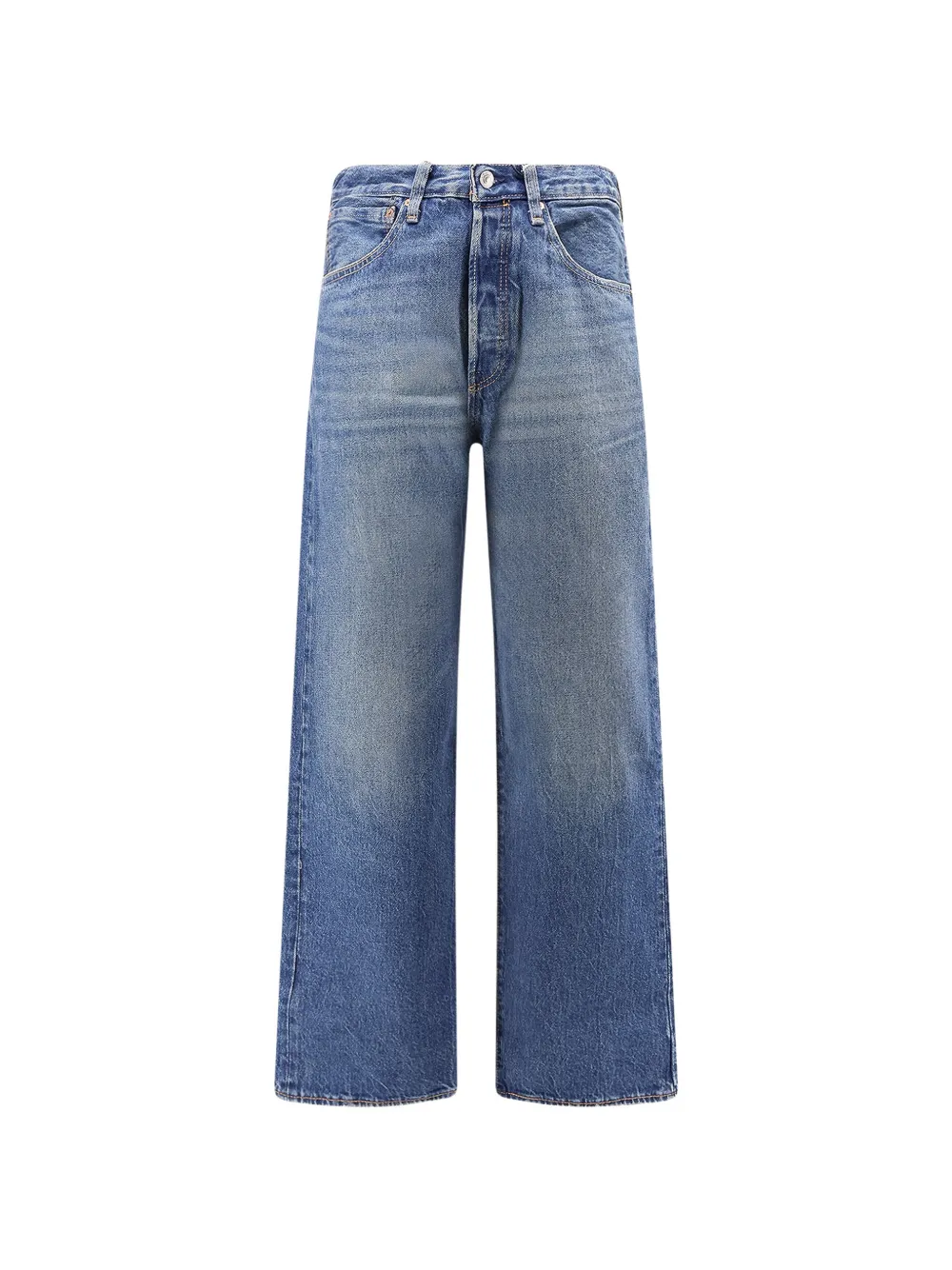 azul algodón costuras en contraste cierre de botón cinco bolsillos diseño ancho