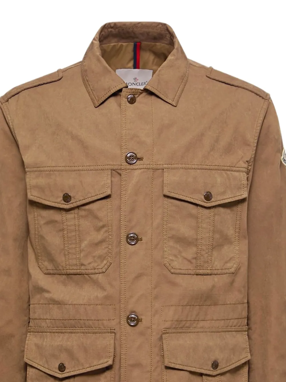 brown point collar button fastening chest pockets front flap pockets shoulder epaulettes
