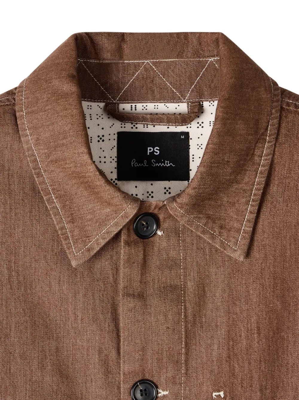 brown button fastening chest patch pocket pointed collar long sleeves buttoned cuffs