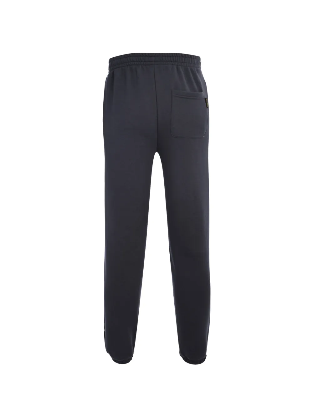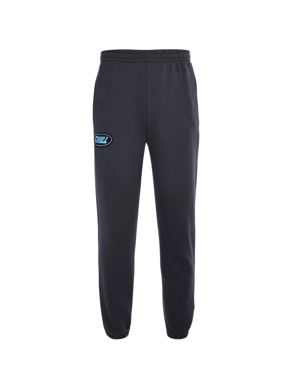 charcoal grey logo patch to the front elasticated waistband two side slit pockets rear patch pocket elasticated ankles