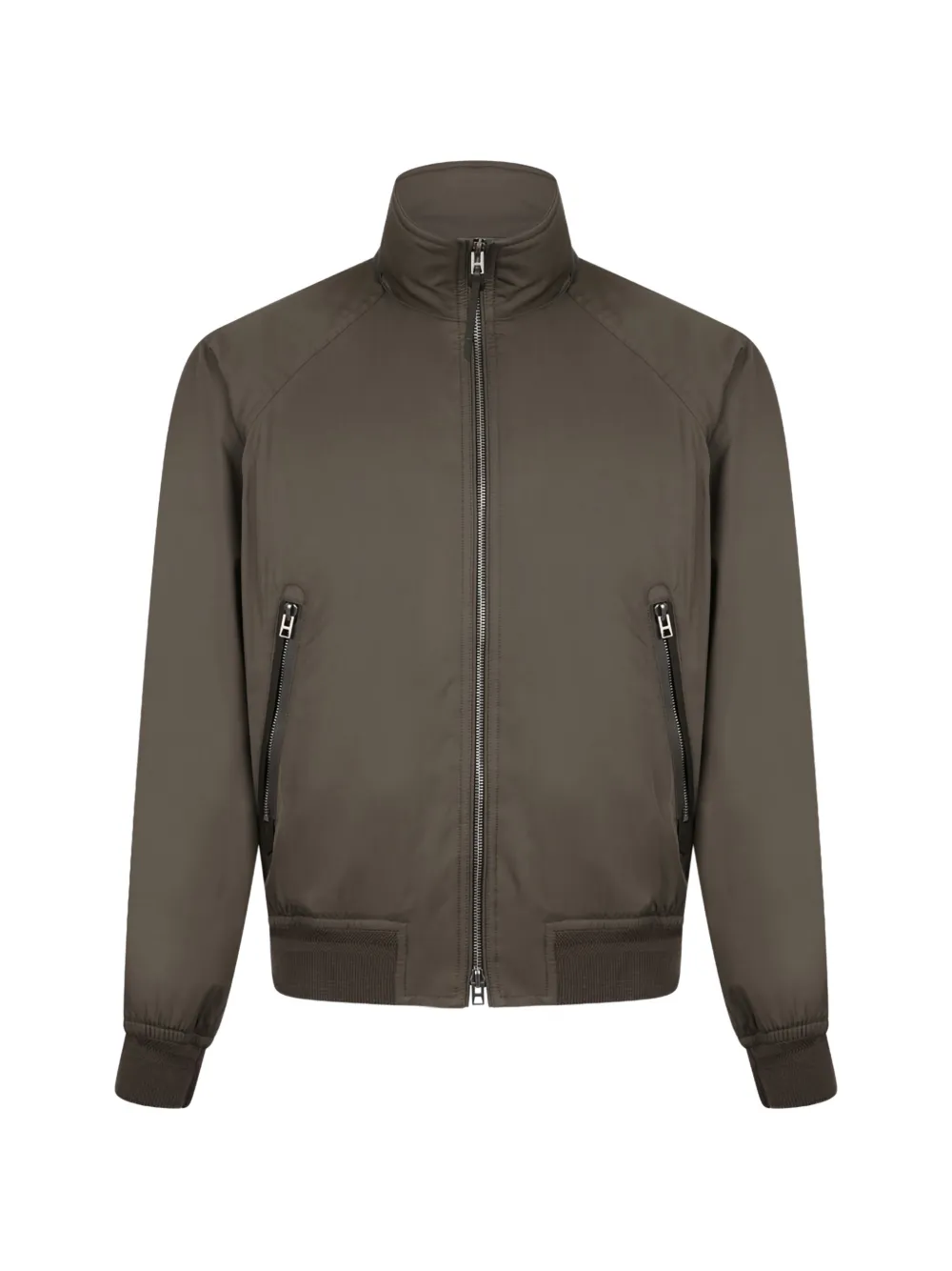 olive green zip-up fastening ribbed hem high neck knitted cuffs side zip pockets