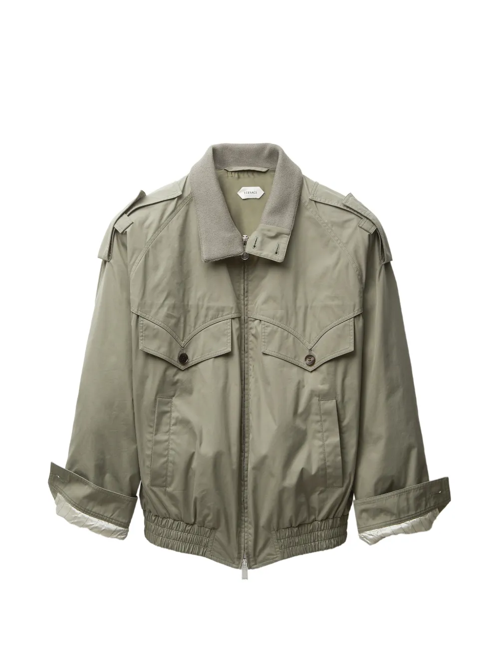Esta chamarra de algodón manga larga presenta solapas con botones, un tirador de cierre Medusa y un pequeño bordado en hilo del logotipo de Versace en la parte posterior del cuello.