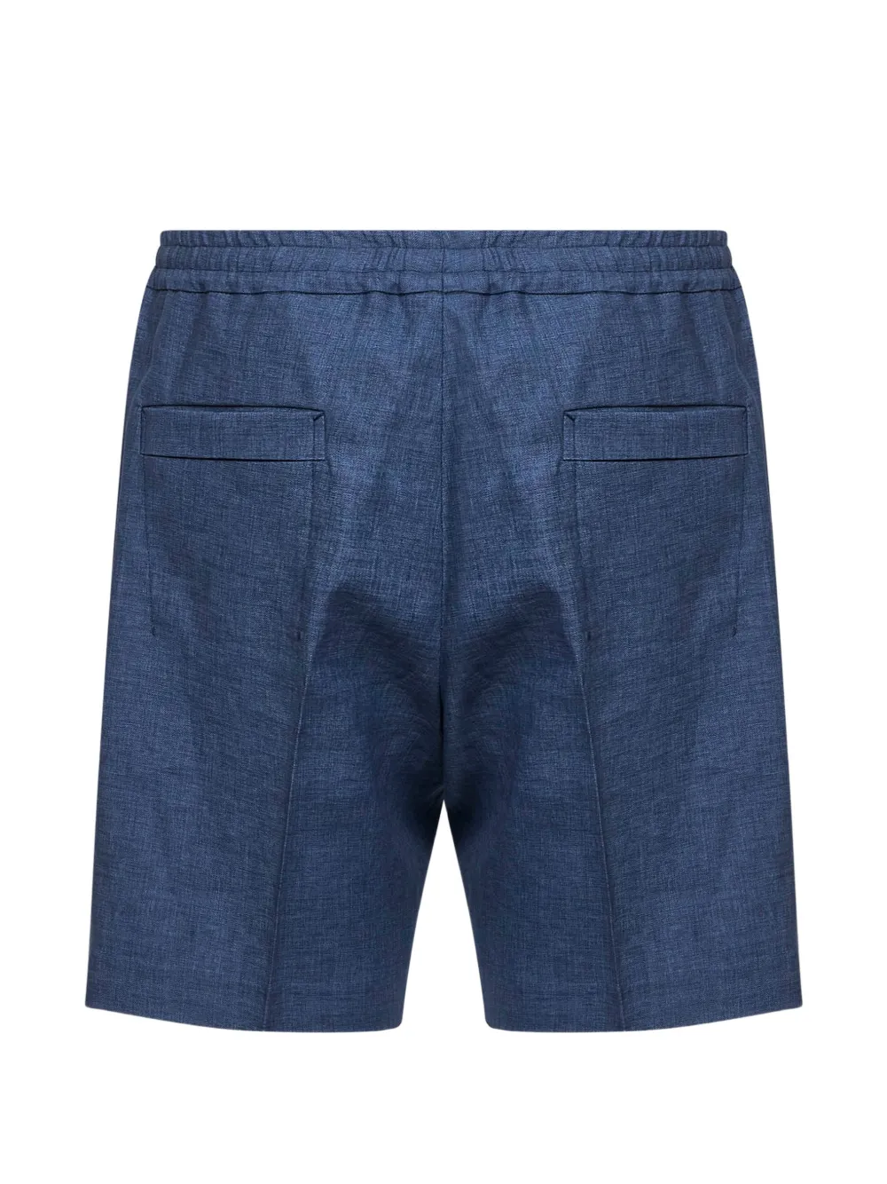 navy blue elasticated waistband inner drawstring side pockets back welt pockets pressed leg creases