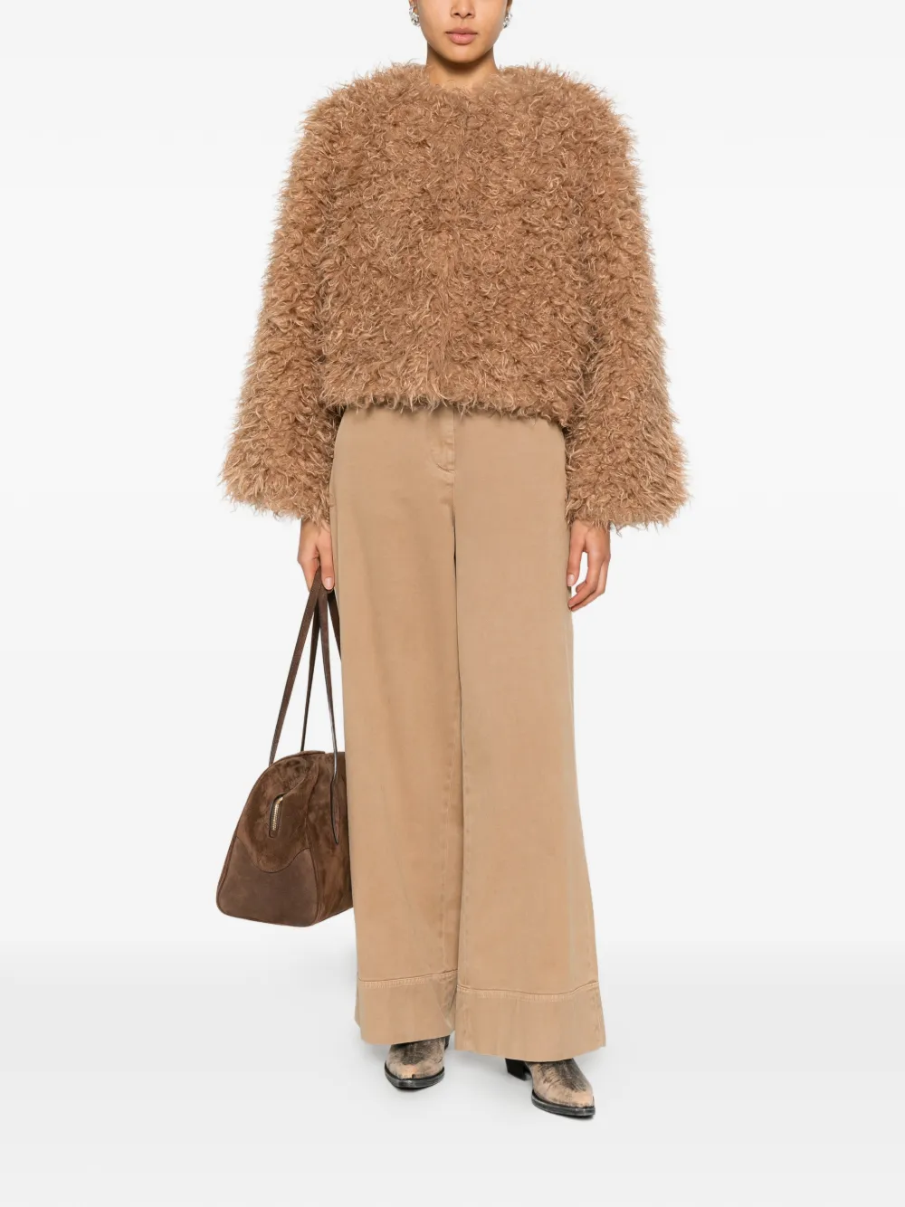 brown textured collar long sleeves cropped style