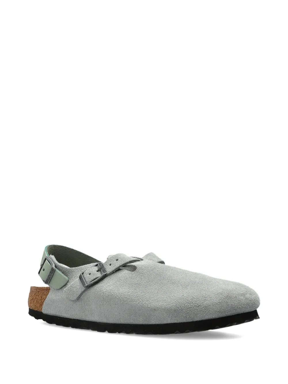 sage suede buckle fastening slingback strap cork sole round toe
