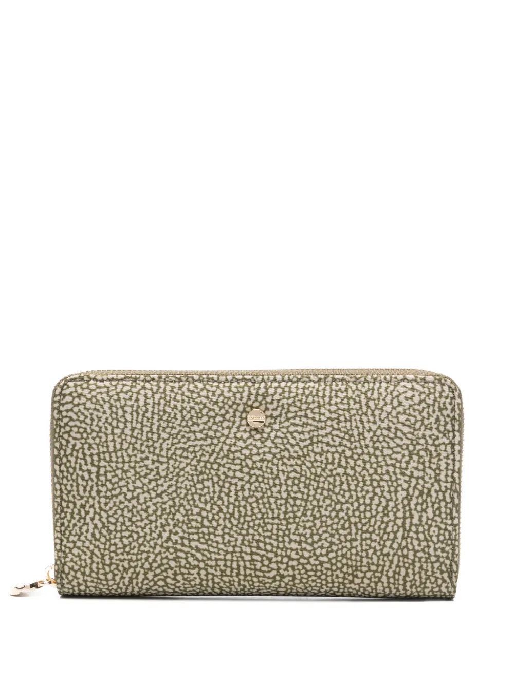 green/beige patterned zip fastening logo plaque internal card slots gold-tone hardware