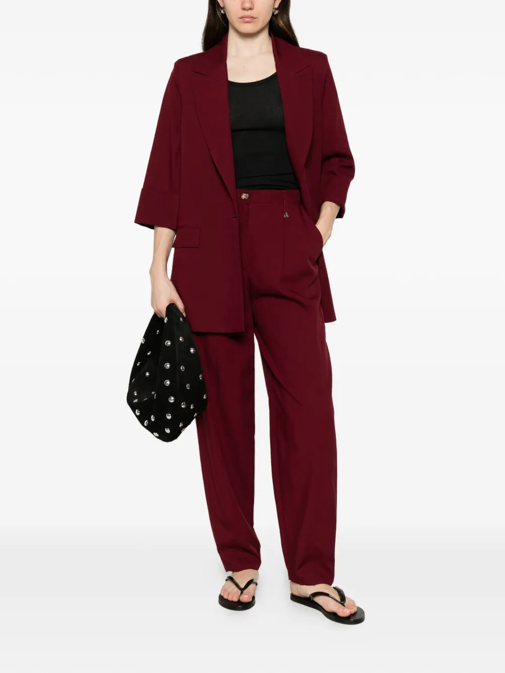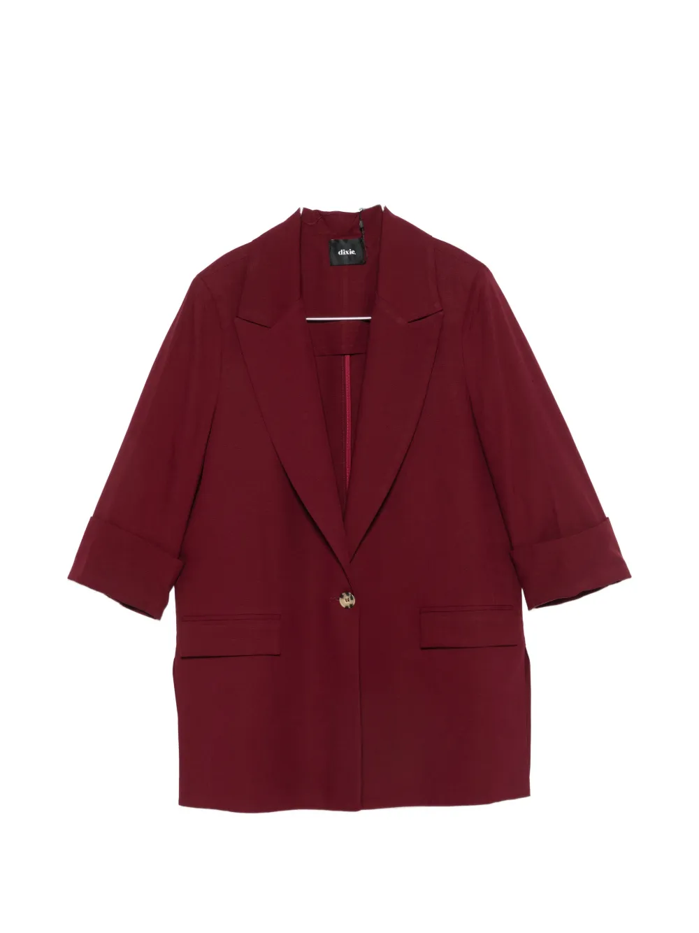 bordeaux notched lapels single breasted button fastening three-quarter sleeves turn-up cuffs front flap pockets belt loops