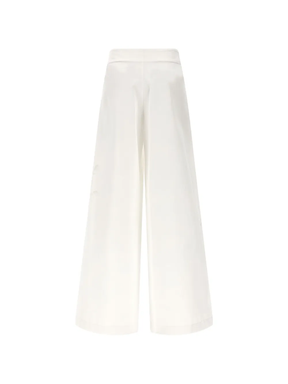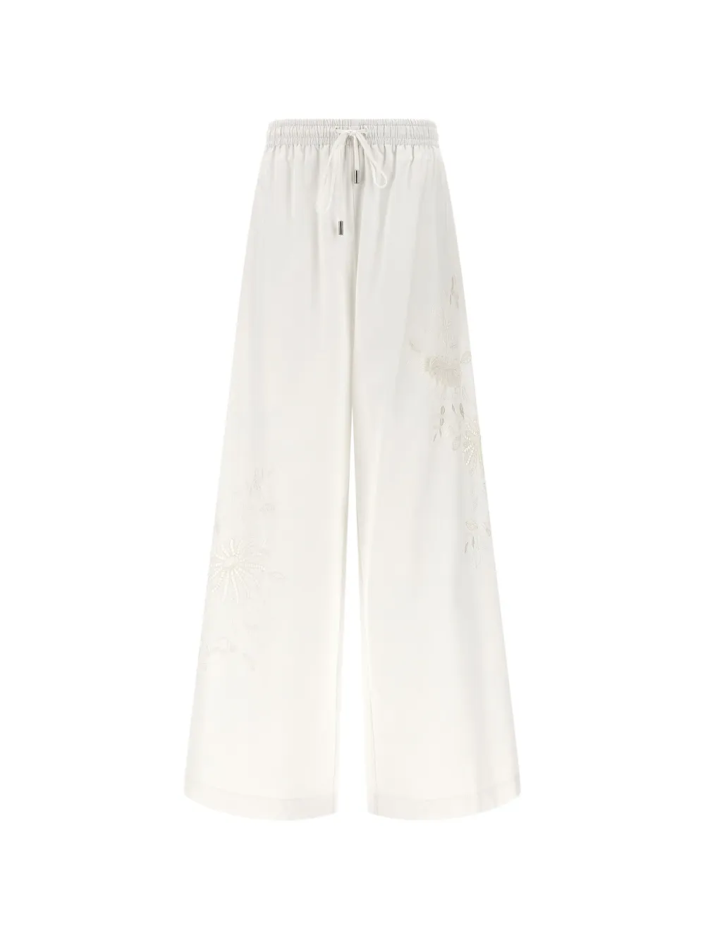 white floral lace inserts elasticated drawstring waistband side slit pockets wide leg