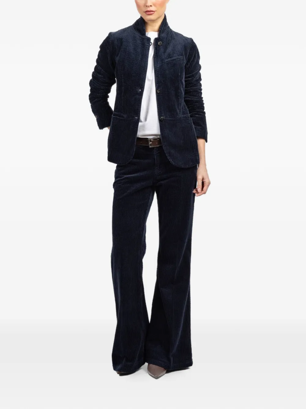 blue corduroy texture stand collar button fastening front flap pockets long sleeves
