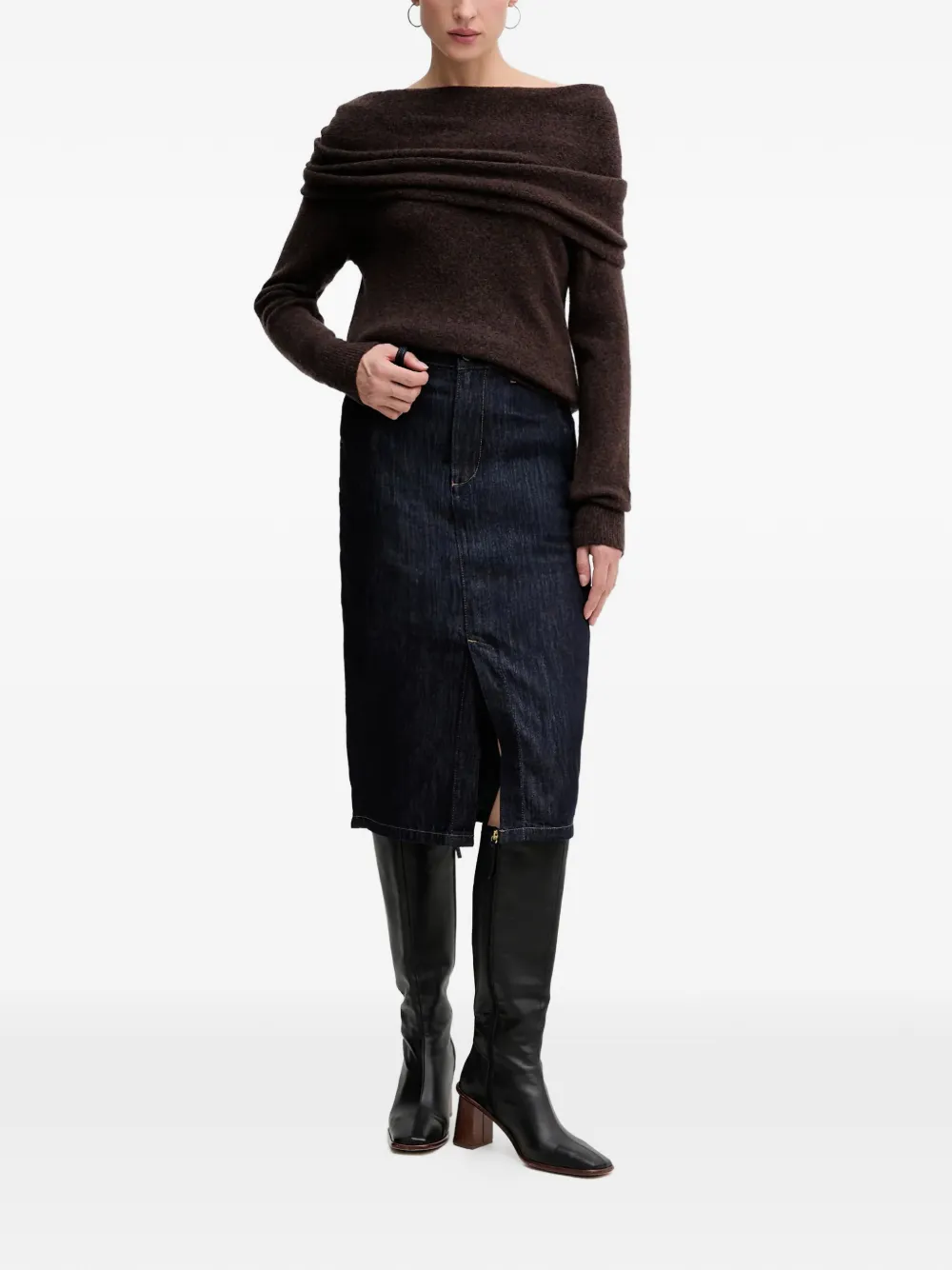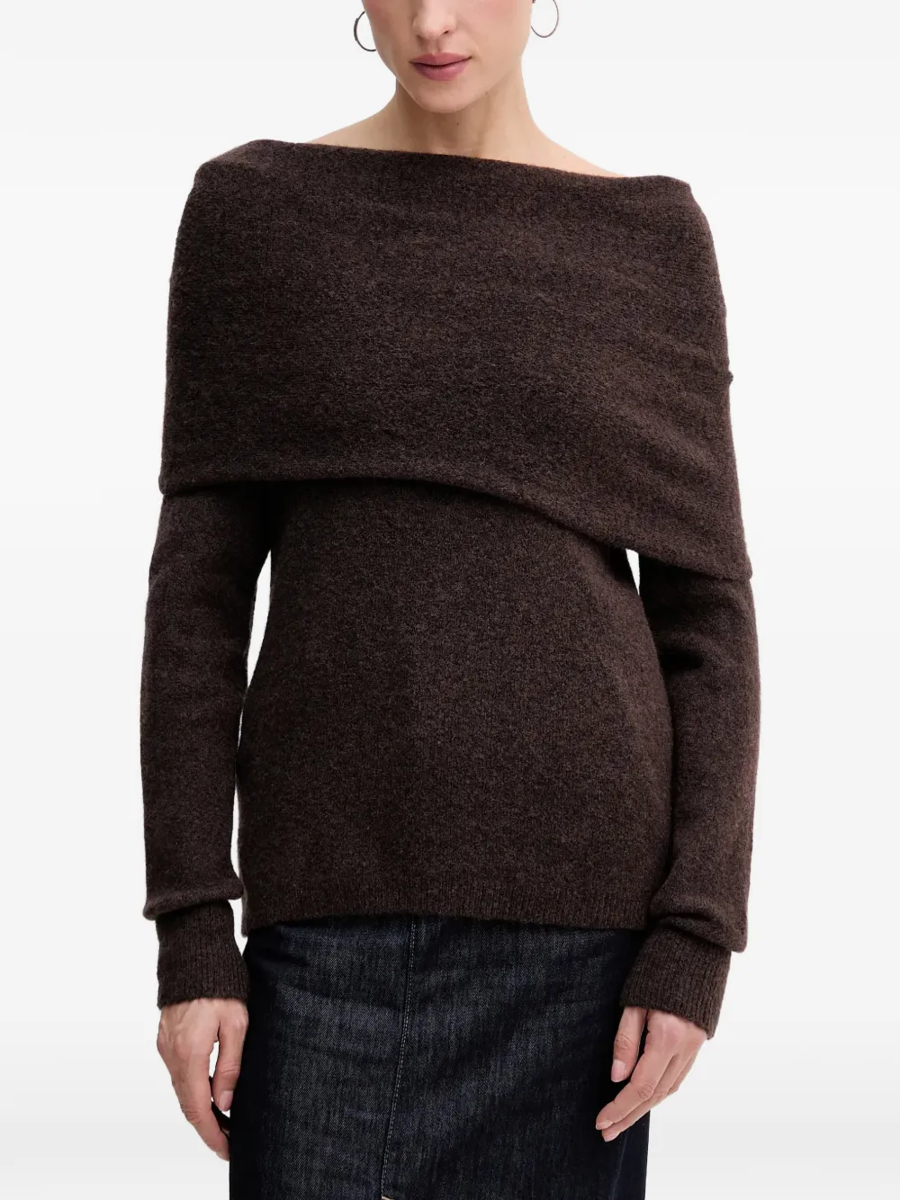brown draped neck long sleeves ribbed trims twisted detail at the back