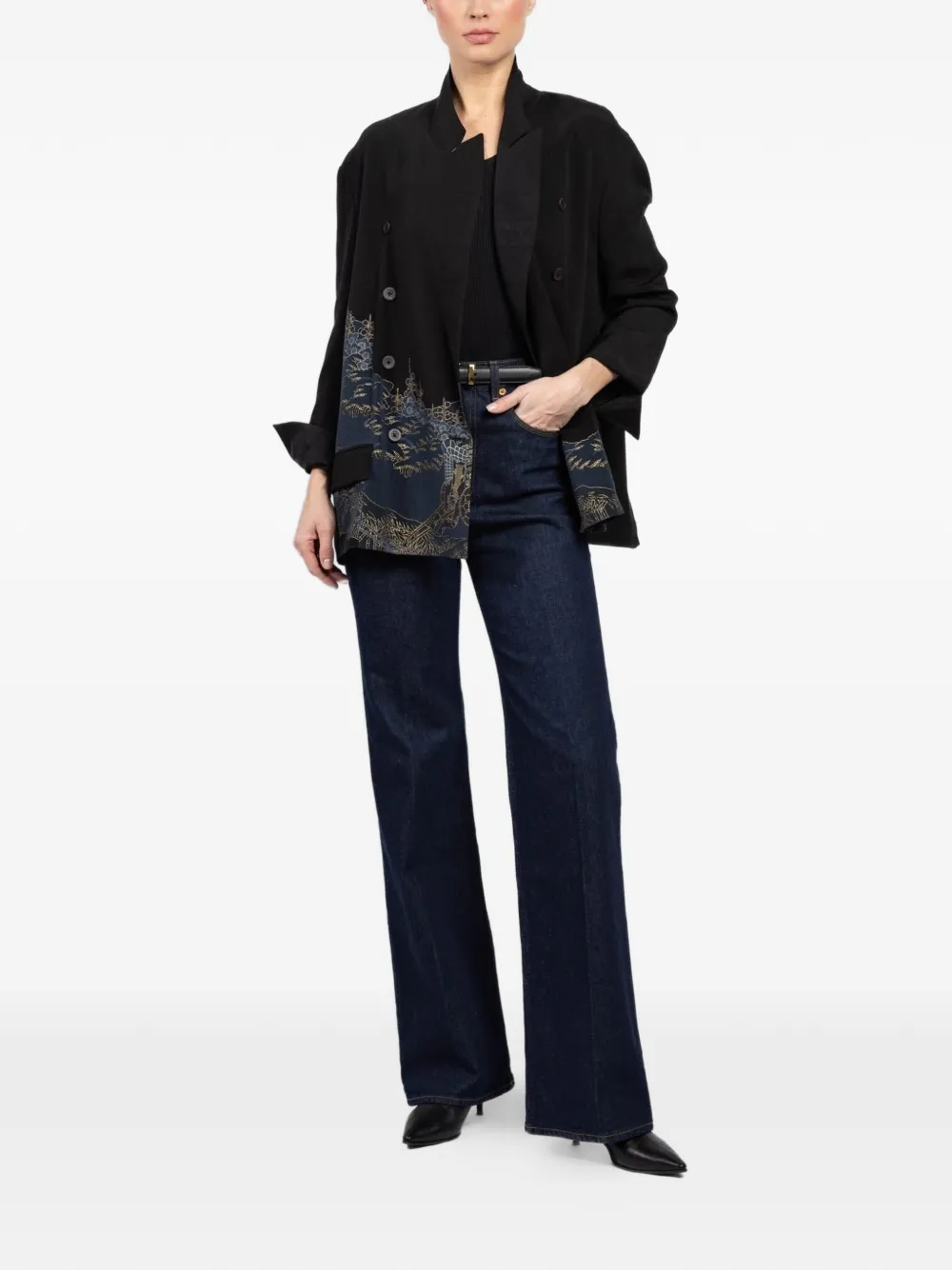 blue spread collar double-breasted button fastening long sleeves flap pockets graphic print