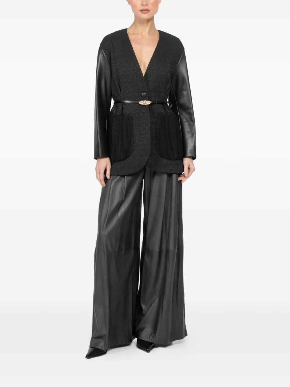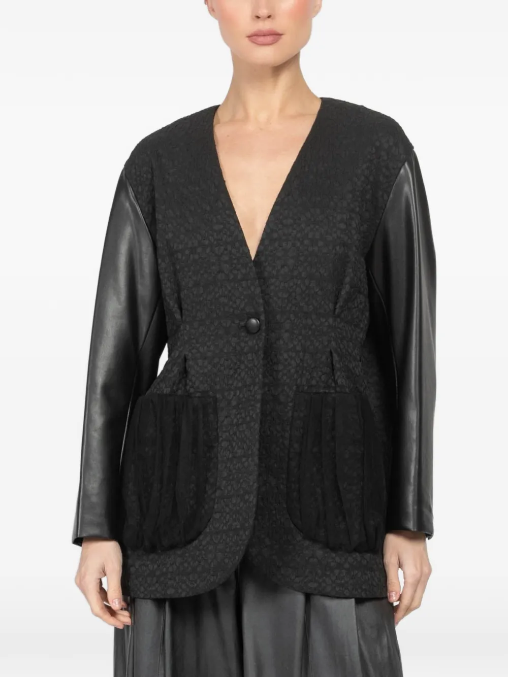 black textured finish panelled construction front pockets single-breasted button fastening