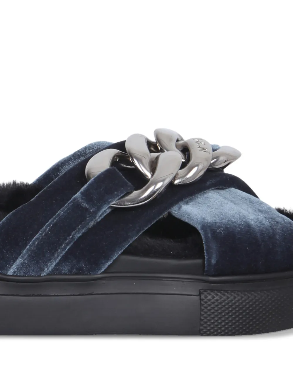 blue chain embellishment crossover strap platform sole faux-fur trim