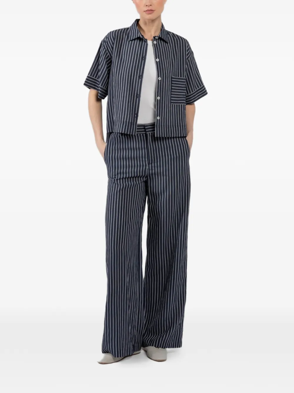 dark blue vertical stripe belt loops side pockets back pocket concealed front fastening
