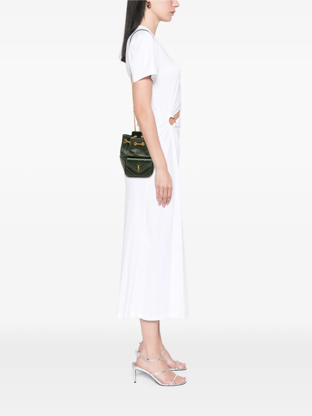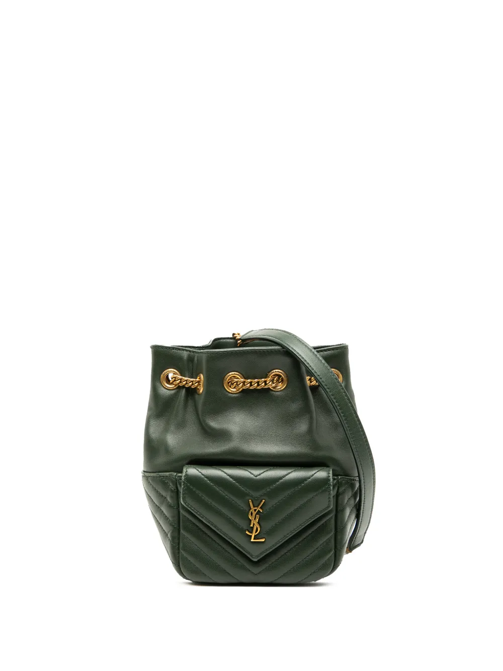 leather body curb chain strap exterior front flap pocket top chain drawstring closure green Serial Number: GUE701631 0822 This item has no inclusions. Condition: GOOD. This previously owned and used item is in good condition with minimal signs of use. This may include fading of material or plating and scratches. Please refer to the photos on this product page for a detailed view of the item, including any damages declared.