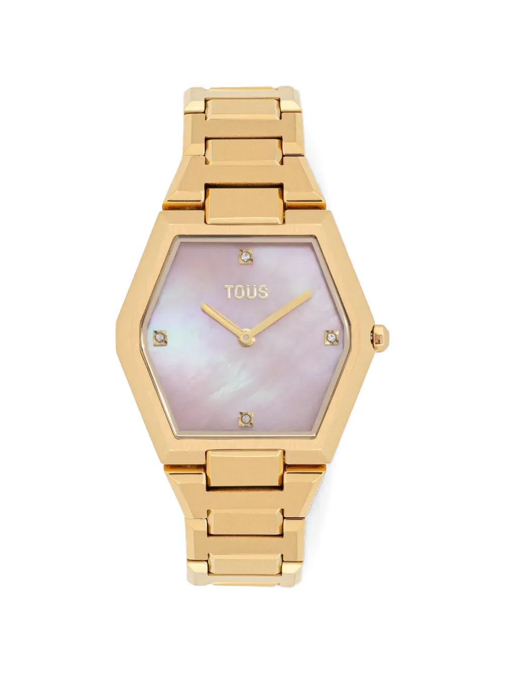 pink dial quartz movement hexagonal case mother-of-pearl dial baton hands bracelet strap water resistant to 3 ATM This item comes with a standard one-year warranty from the boutique.