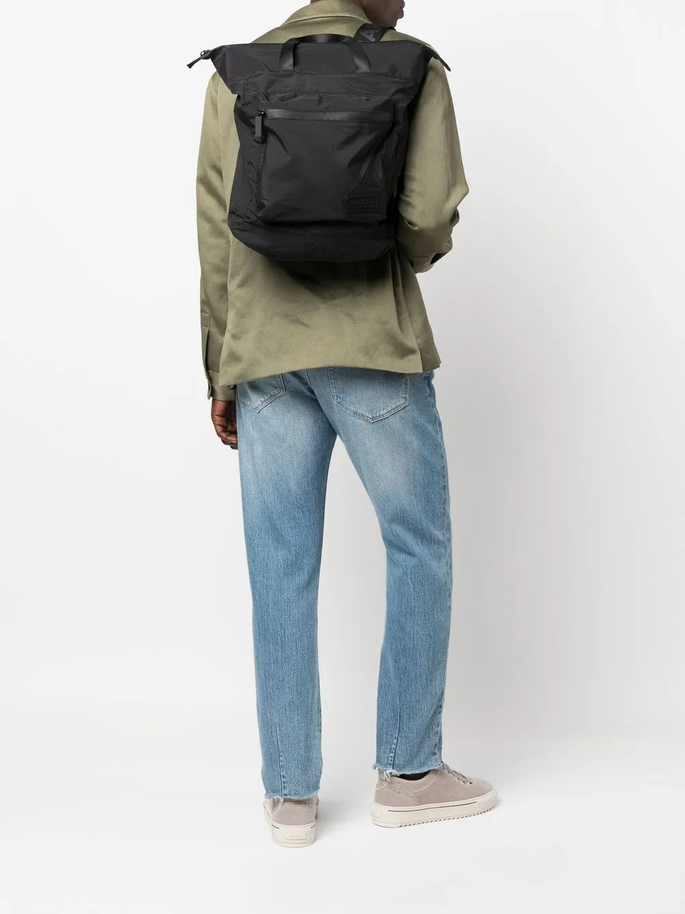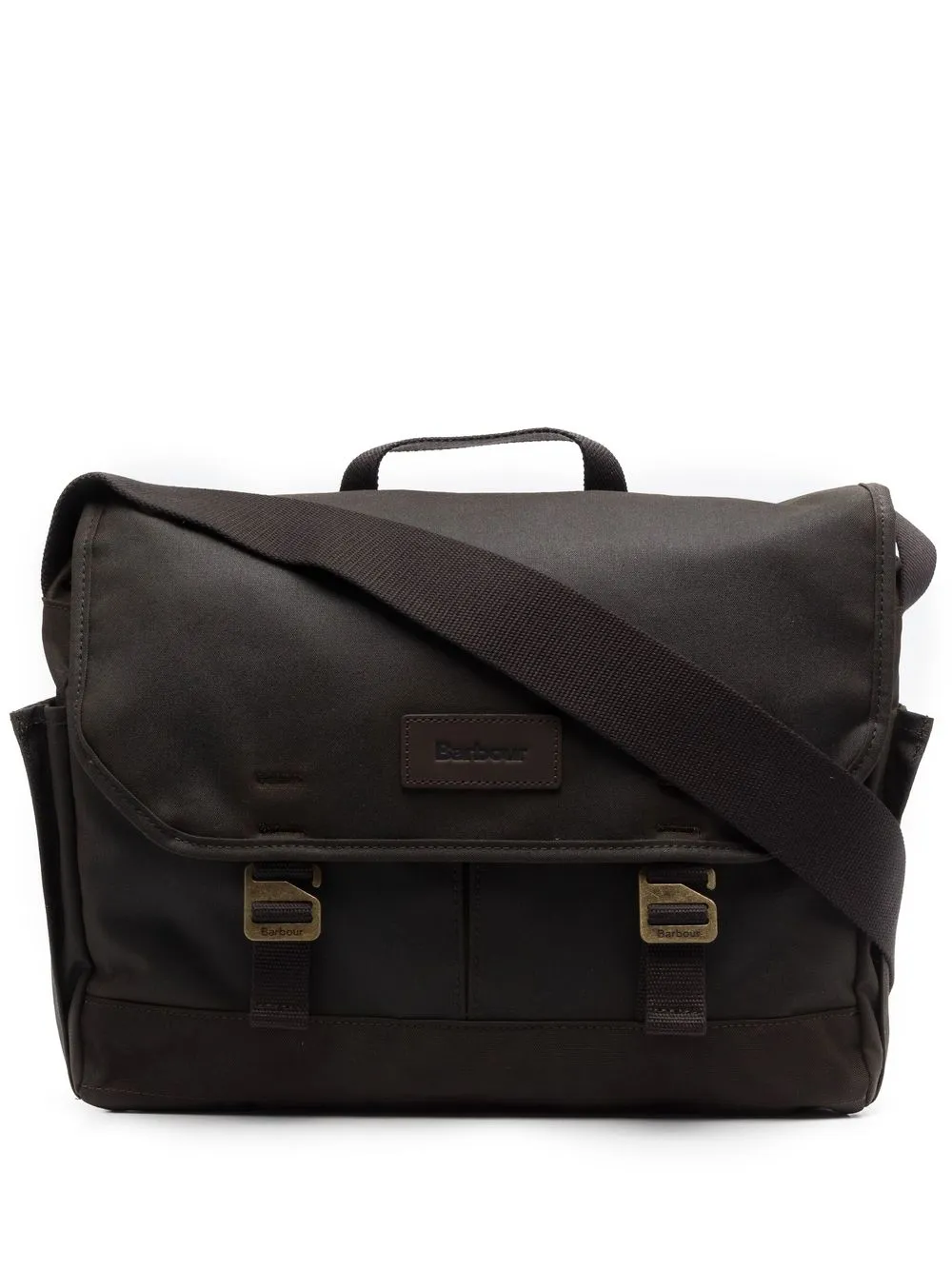 logo-patch backpack from BARBOUR featuring black, flat top handles, top zip fastening, main compartment, logo patch to the front, front zip-fastening pouch pocket and wide shoulder straps.