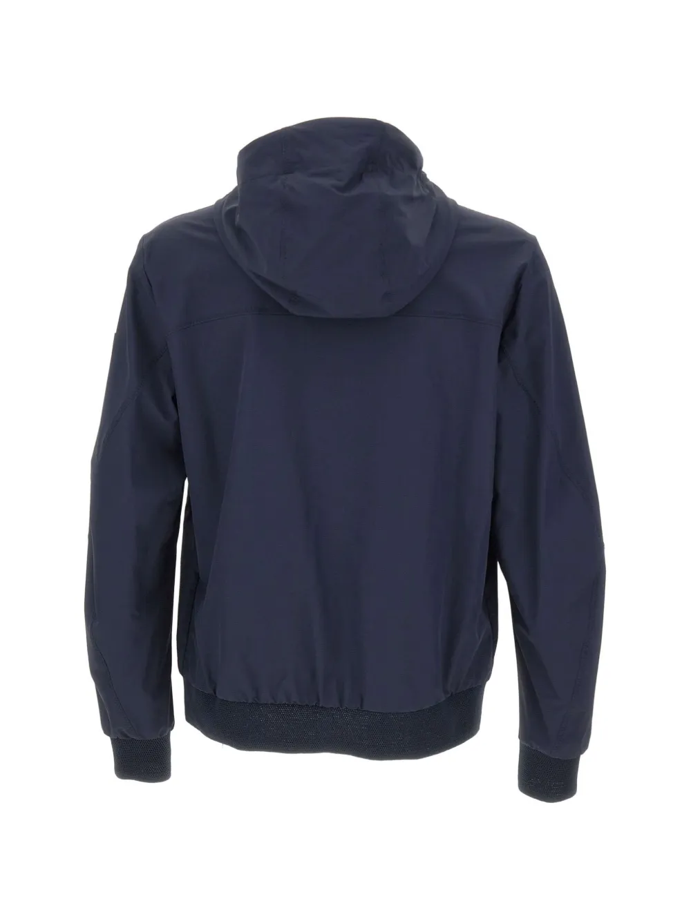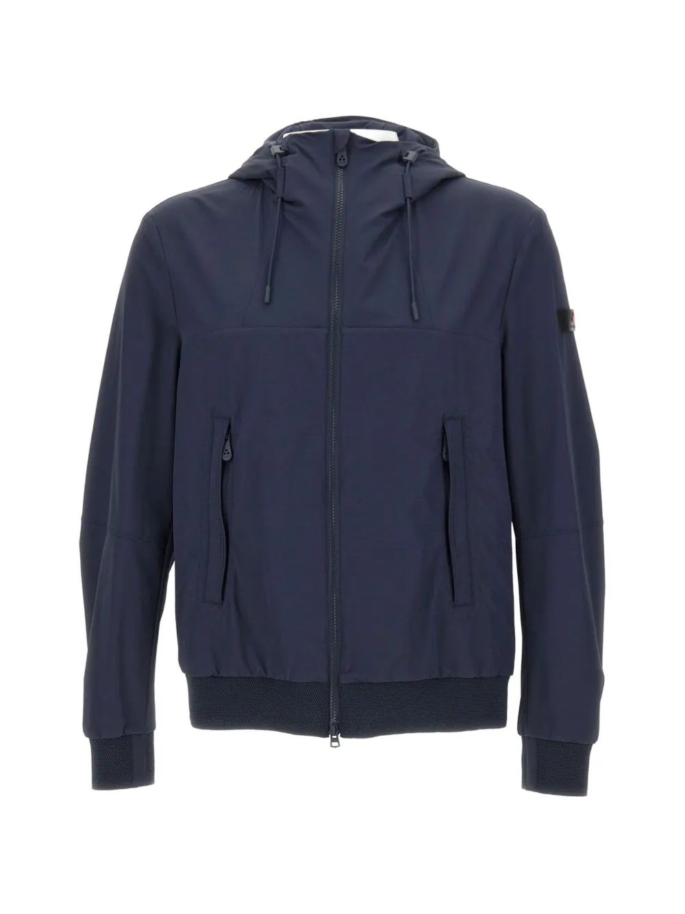 dark blue drawstring-adjustable hood two-way zip fastening long sleeves logo patch to the sleeve two side zip pockets elasticated knit cuffs elasticated knit hem regular fit