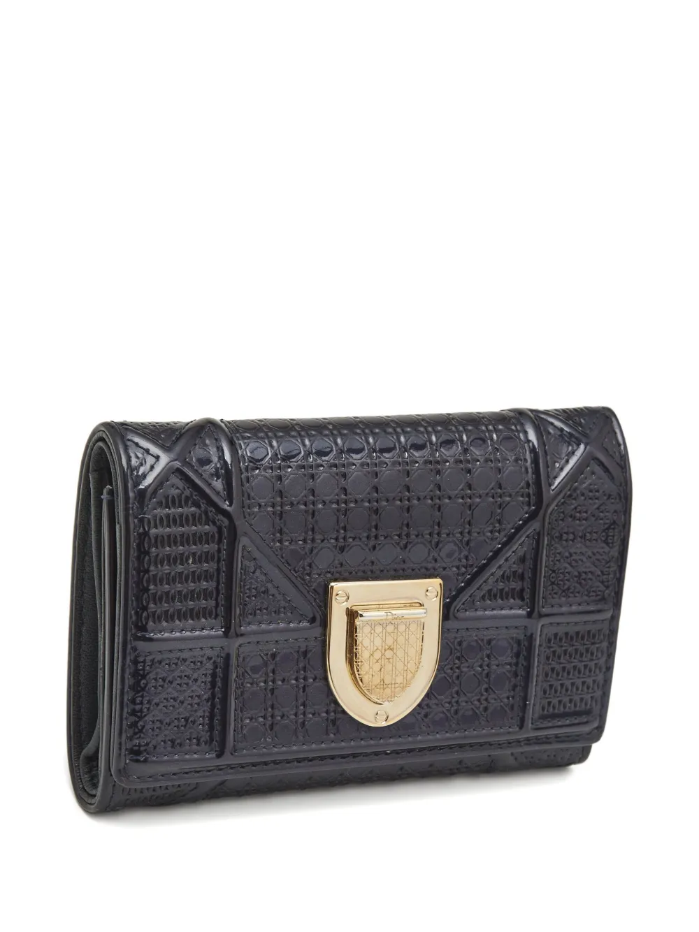 Patent Leather|Diorama|Fair|Petite in size but bold in presence, this Diorama wallet in glossy blue patent leather brings a dash of haute couture to your daily essentials. The architectural lines and signature crest-shaped clasp mirror the iconic Diorama bag, while the trifold layout offers smart functionality in a compact form.