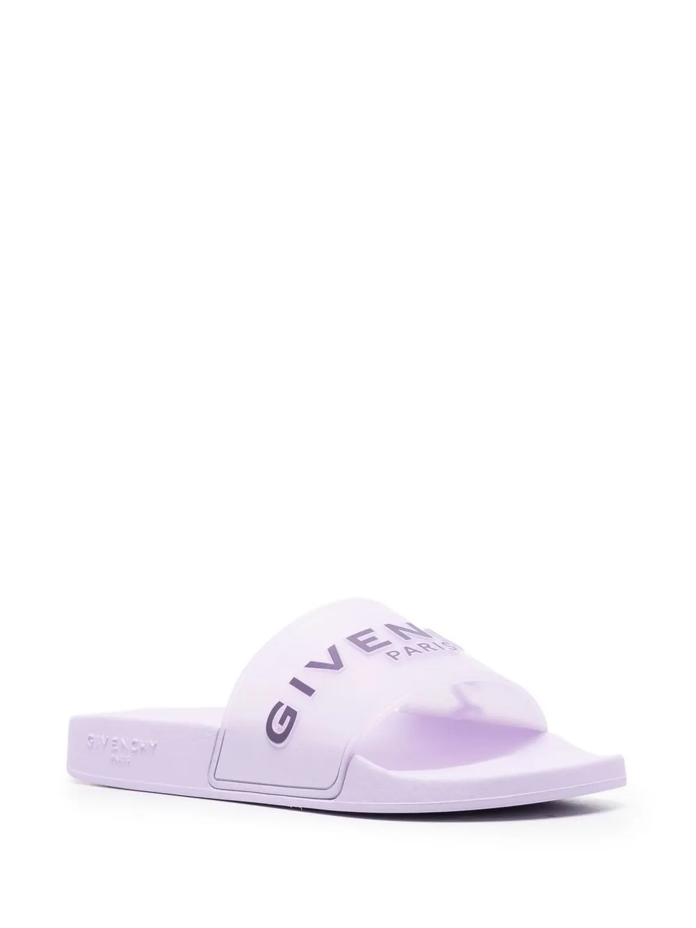 lilac/black slip-on style logo print to the front open toe moulded footbed flat rubber sole