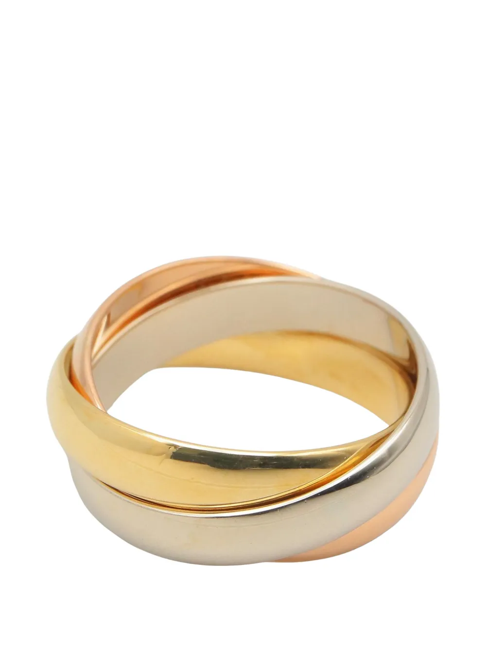 18K rose gold 18K yellow gold 18K white gold polished finish interlocking bands engraved logo hallmarked slip-on style Condition: GOOD. This previously owned and used item is in good condition with minimal signs of use. This may include fading of material or plating and scratches.