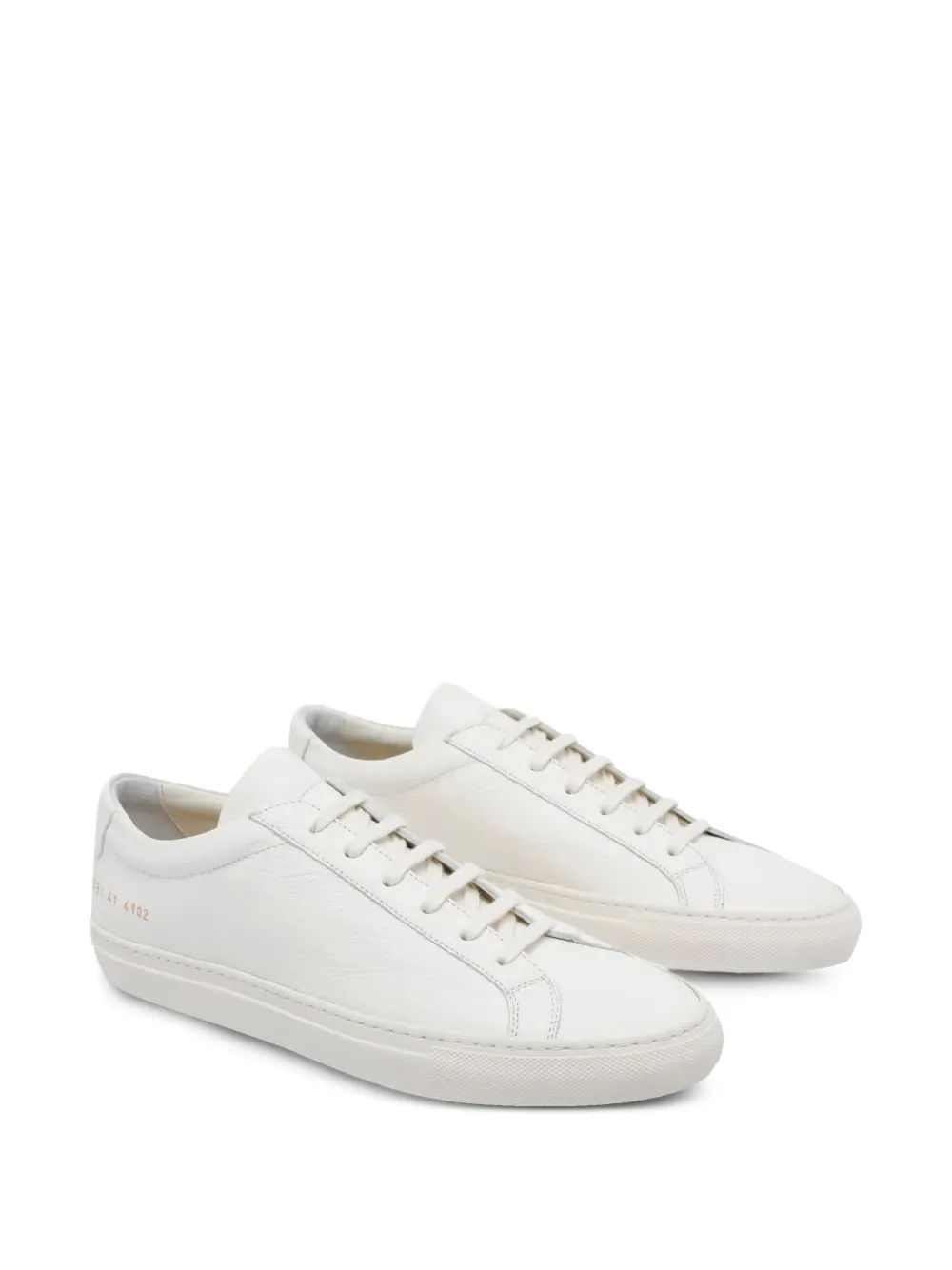 white leather grained texture round toe front lace-up fastening gold-tone serial number stamp flat rubber sole