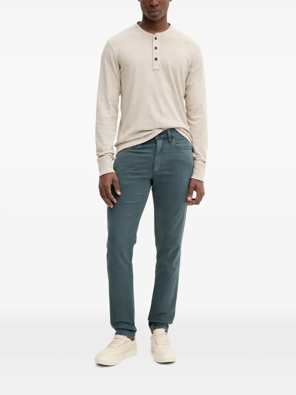 blue tonal topstitching five pockets logo patch belt loops