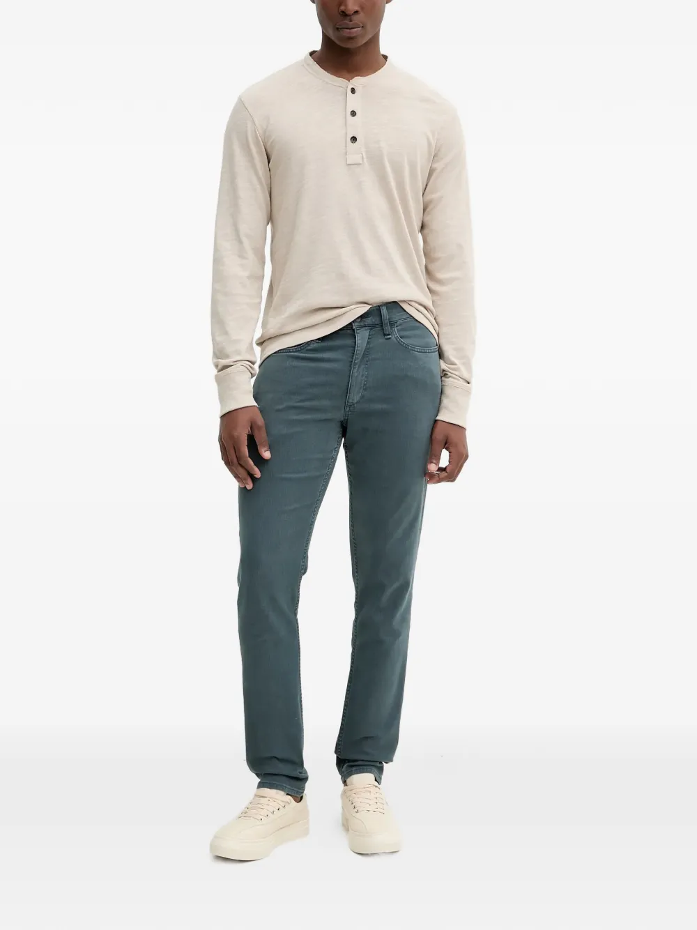 blue tonal topstitching five pockets logo patch belt loops