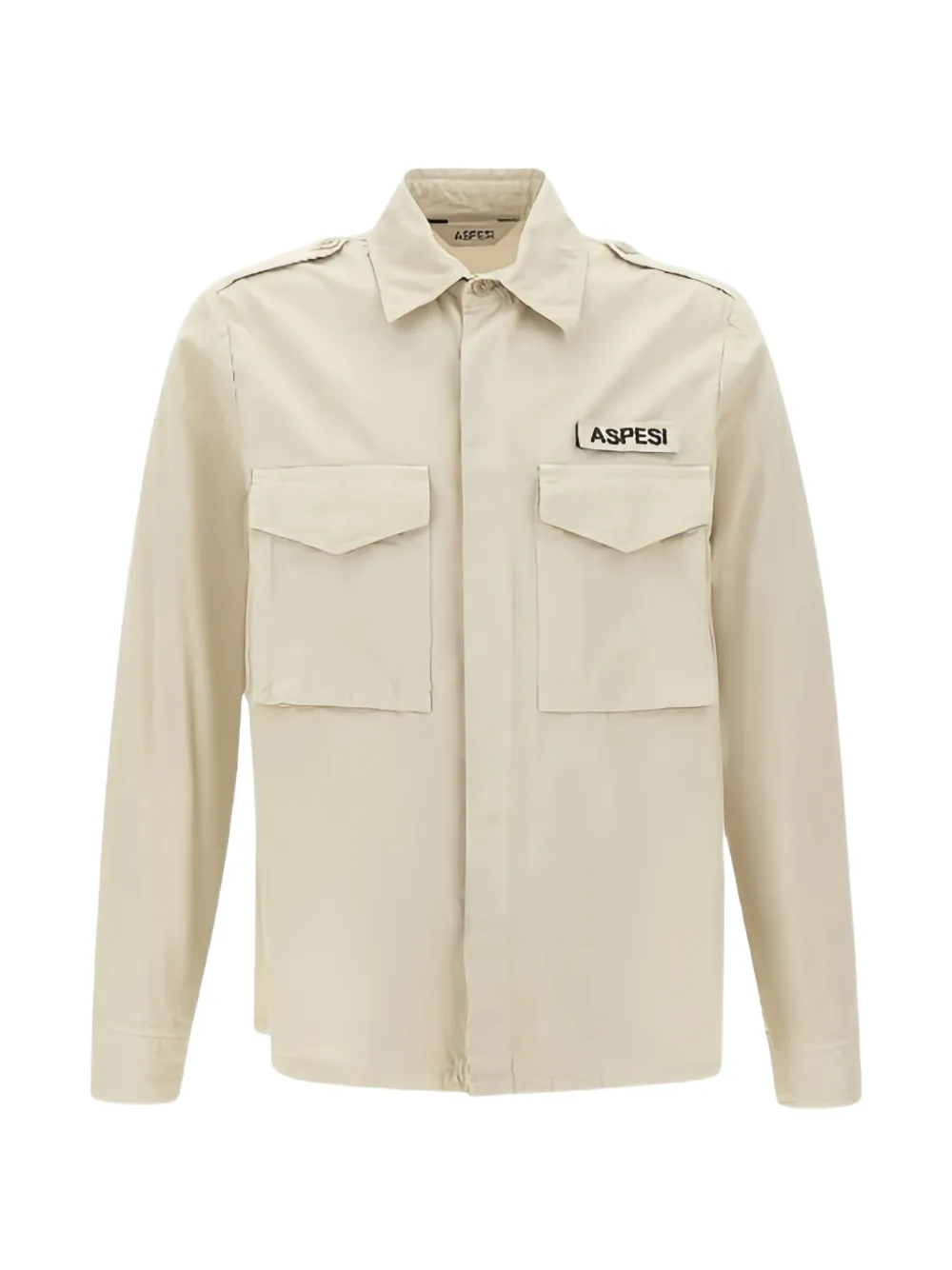 beige spread collar shoulder epaulettes logo patch to the chest two chest flap pockets concealed front fastening long sleeves buttoned cuffs straight hem