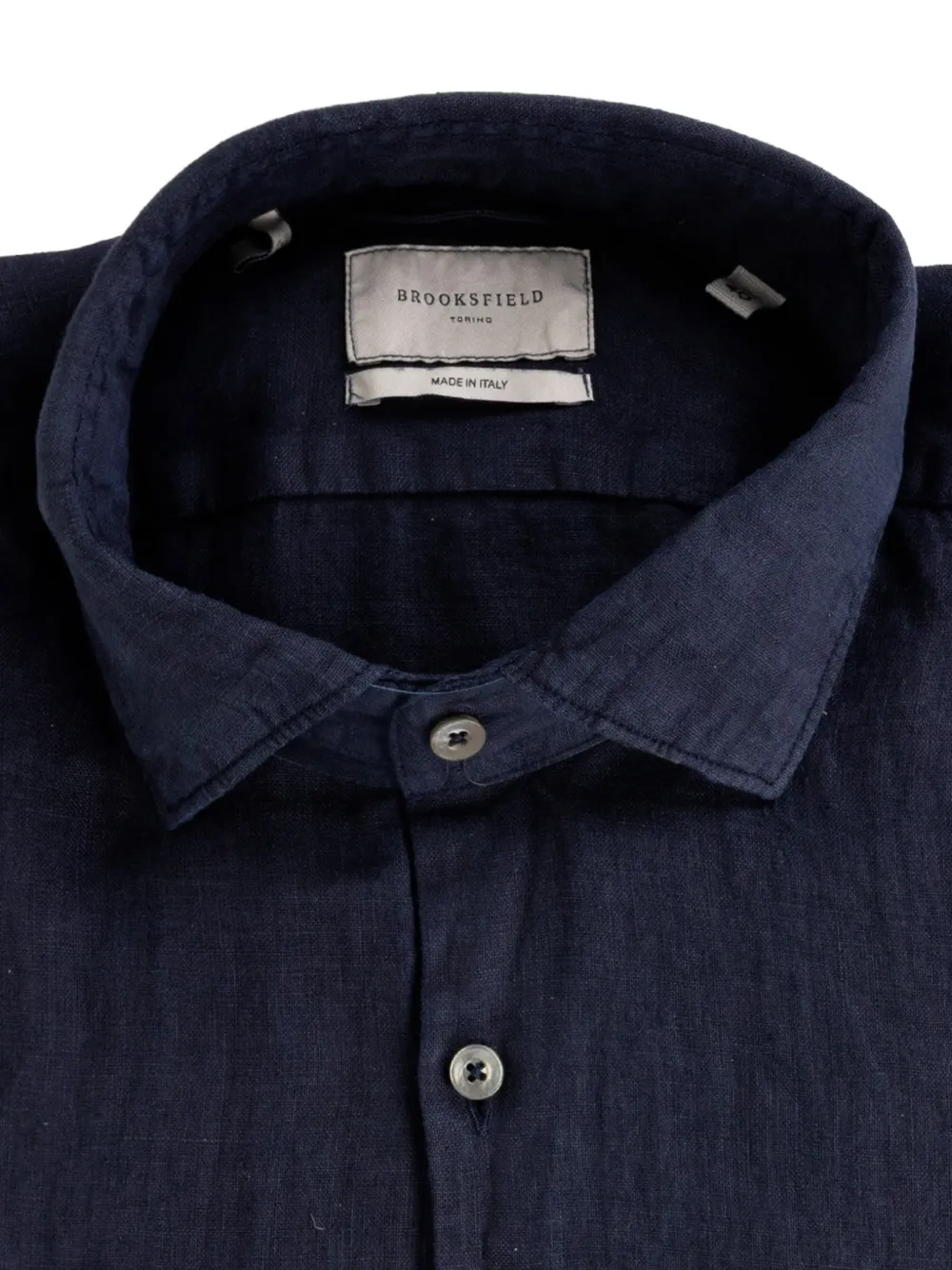 navy blue slub texture front button fastening classic collar long sleeves buttoned cuffs curved hem