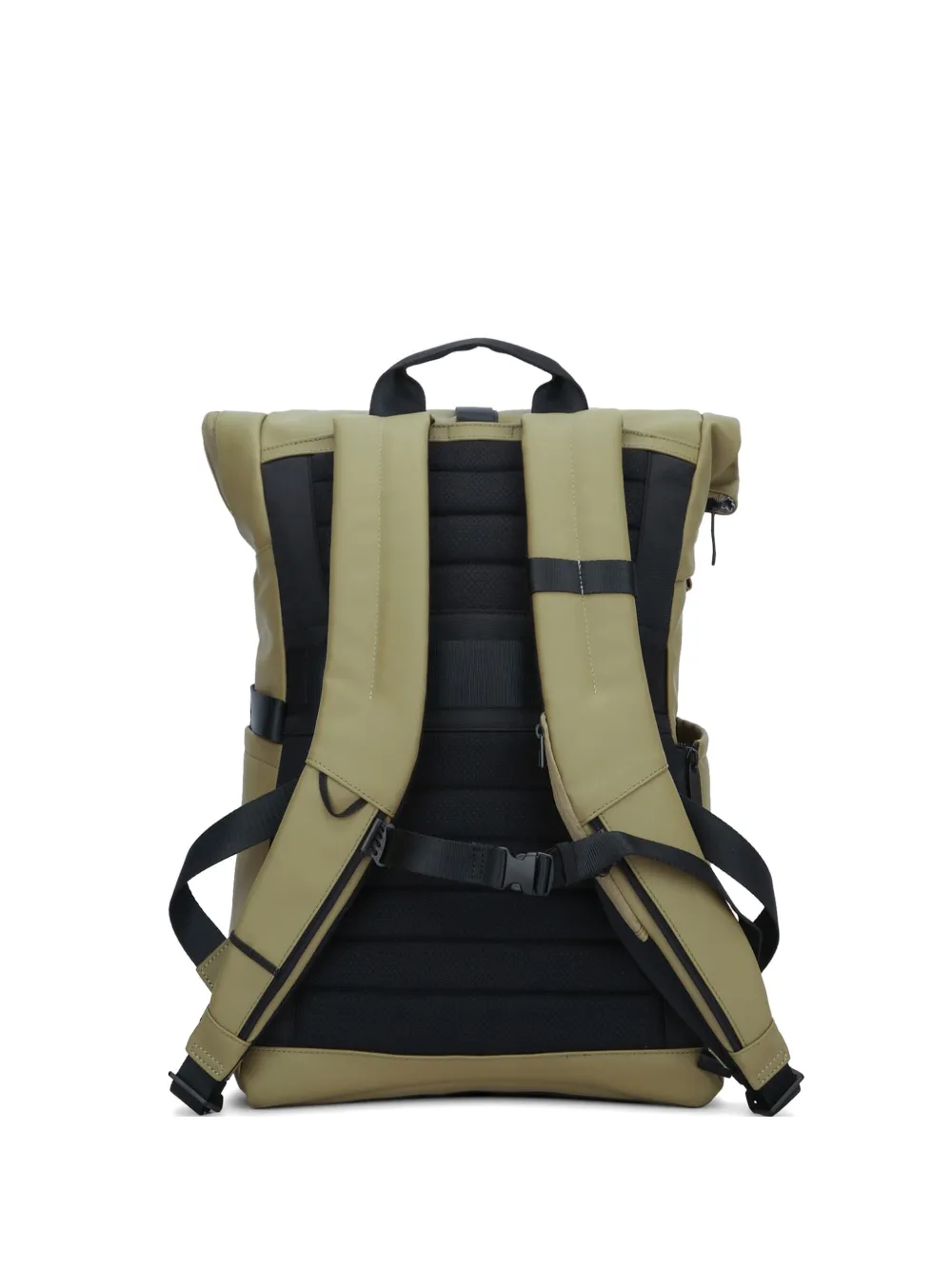 olive green roll-top fastening buckle-fastening strap front zip-fastening pocket single top handle adjustable shoulder straps logo lettering to the front mesh back panel